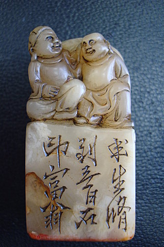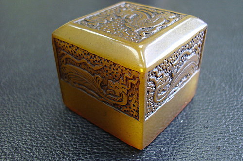 清代是壽山石雕的昌盛時期,史籍記載,雍正時壽山石雕已納入官府的征稅范圍,雕刻藝術因材施藝,分別雕刻印章、文具、人物、動物及玉鑲嵌各種器皿,印章的鈕飾更加精致多樣,表現技法上出現了陰刻和鏈條技法,乾隆皇帝用過的一套"寶印",就是用一塊田黃刻制並由兩根鏈條連接起來的三顆印章,技藝高超,堪稱國之瑰寶。